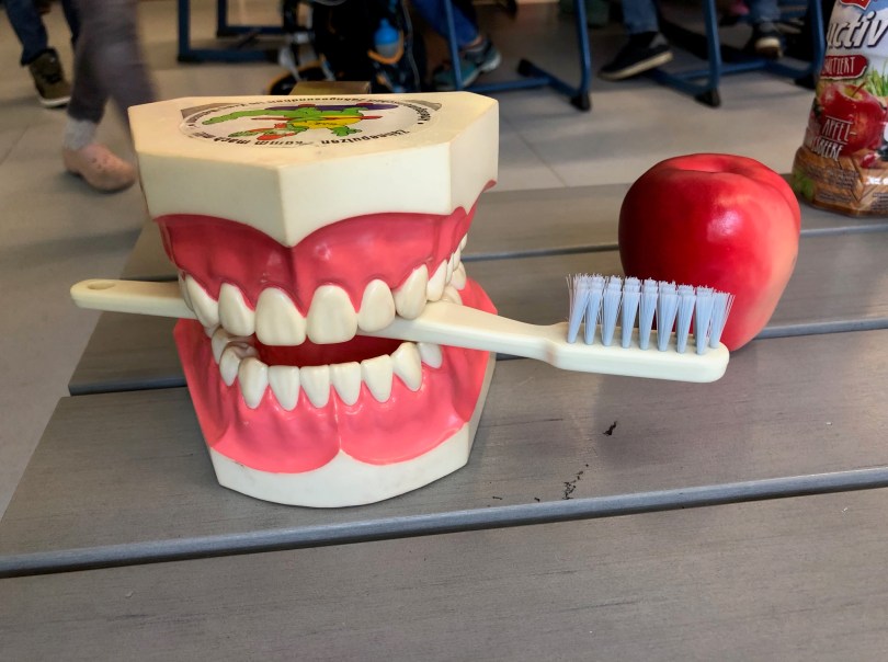 Micki das Zahnputzkrokodil brachte Zahnbürsten, Zahncreme und Becher mit. Nach seiner Anweisung wurden nach dem „KAI-Prinzip“ die Kau-, Außen- und Innenflächen geputzt.